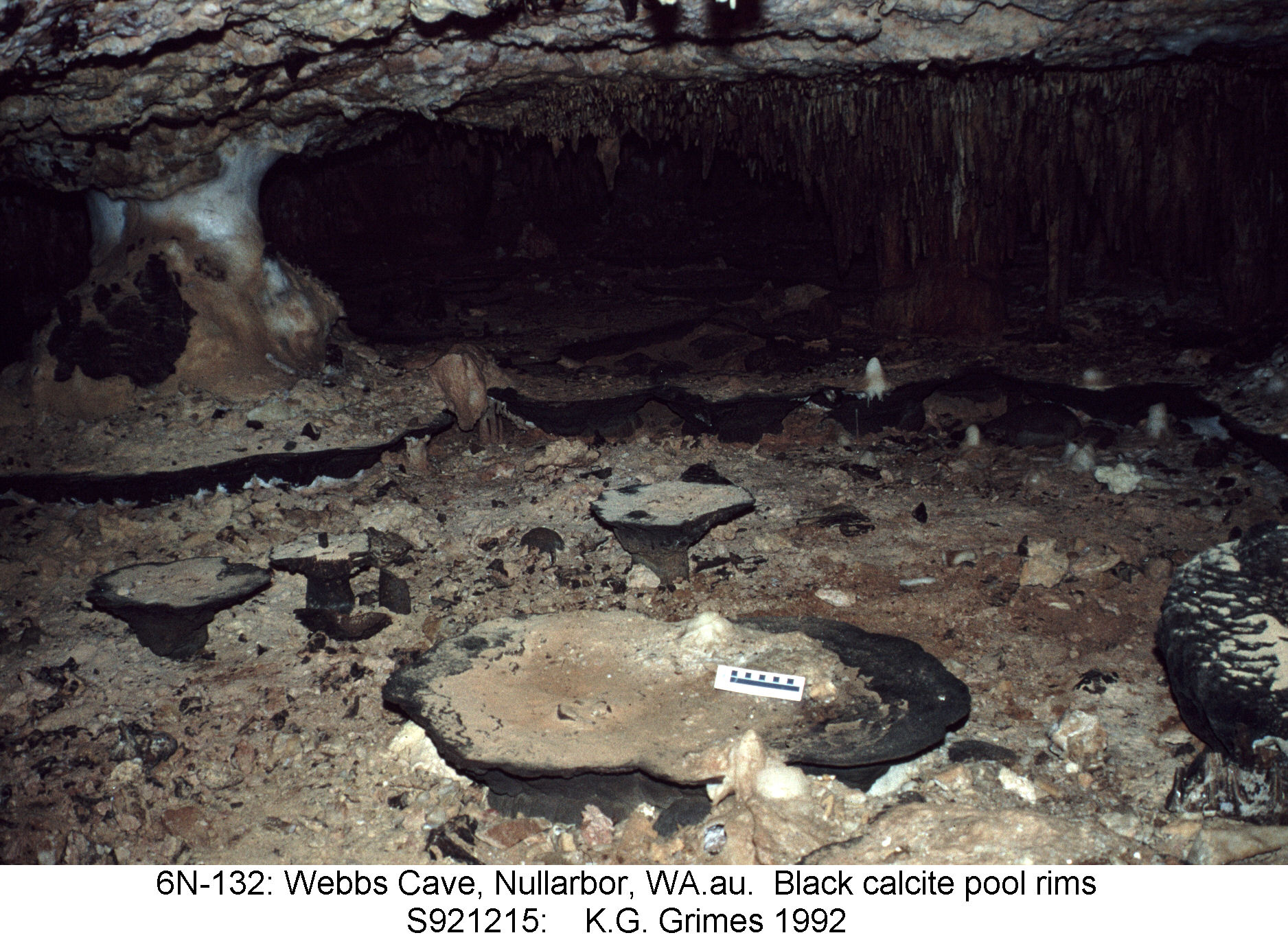 Old black calcite pool speleothems, in Webbs Cave (6N-132) S921215.jpg |