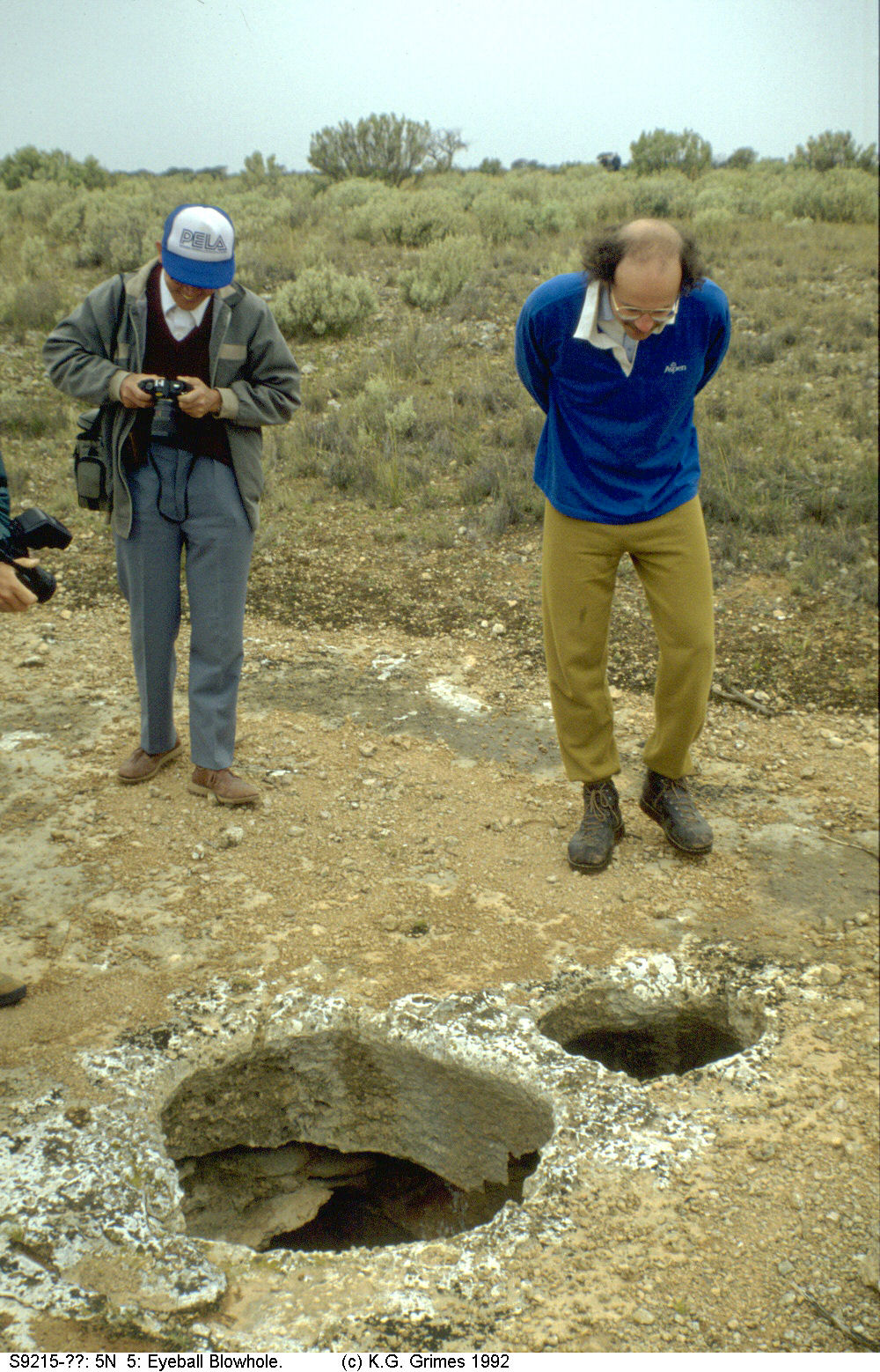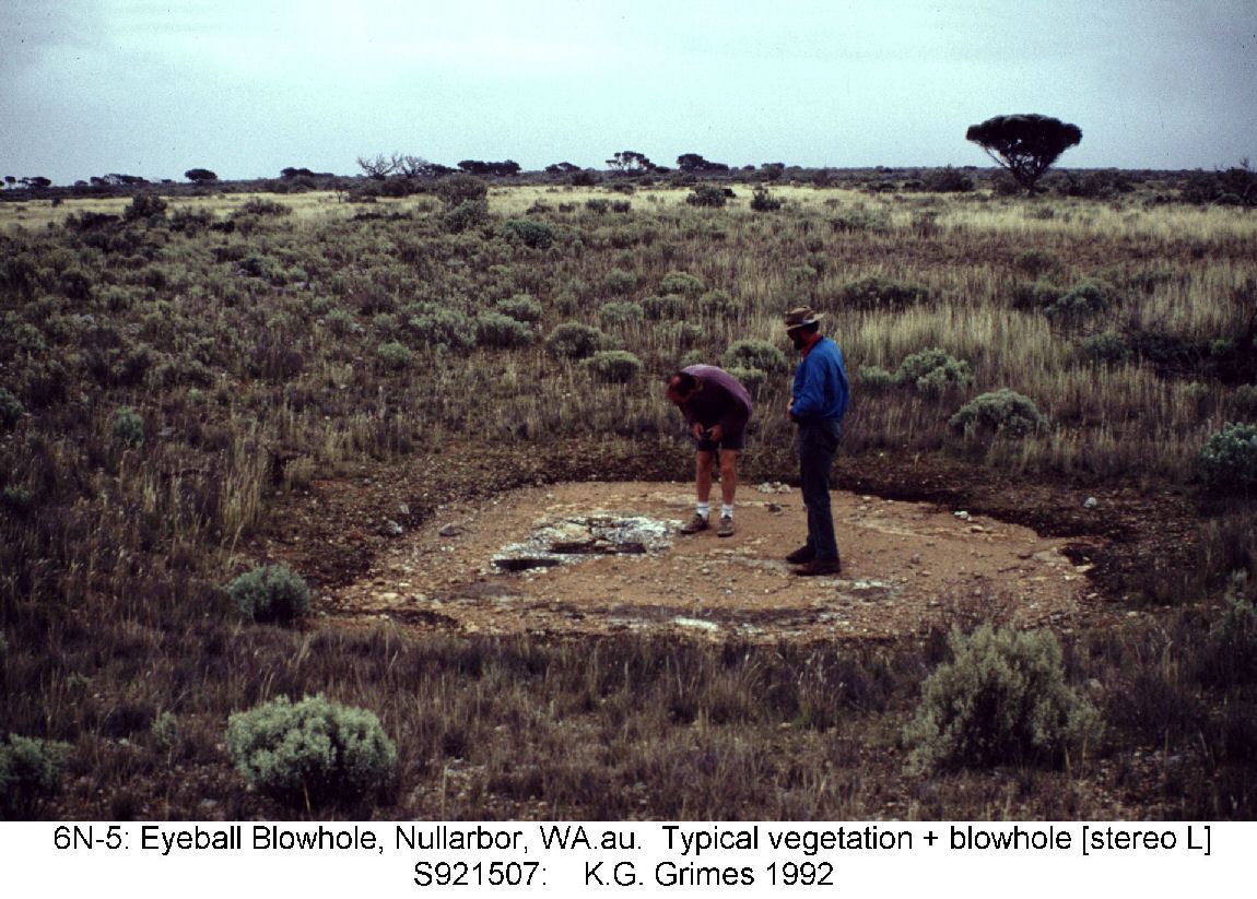 Blowholes are a common features of the surface of the plain. They are vertical shafts which may connect to small shallow caves, though most just end in a fine impenetrable spongework. They "blow" or "suck" according to the barometric pressure. Note the saltbush vegetation in the background. S921512.jpg |