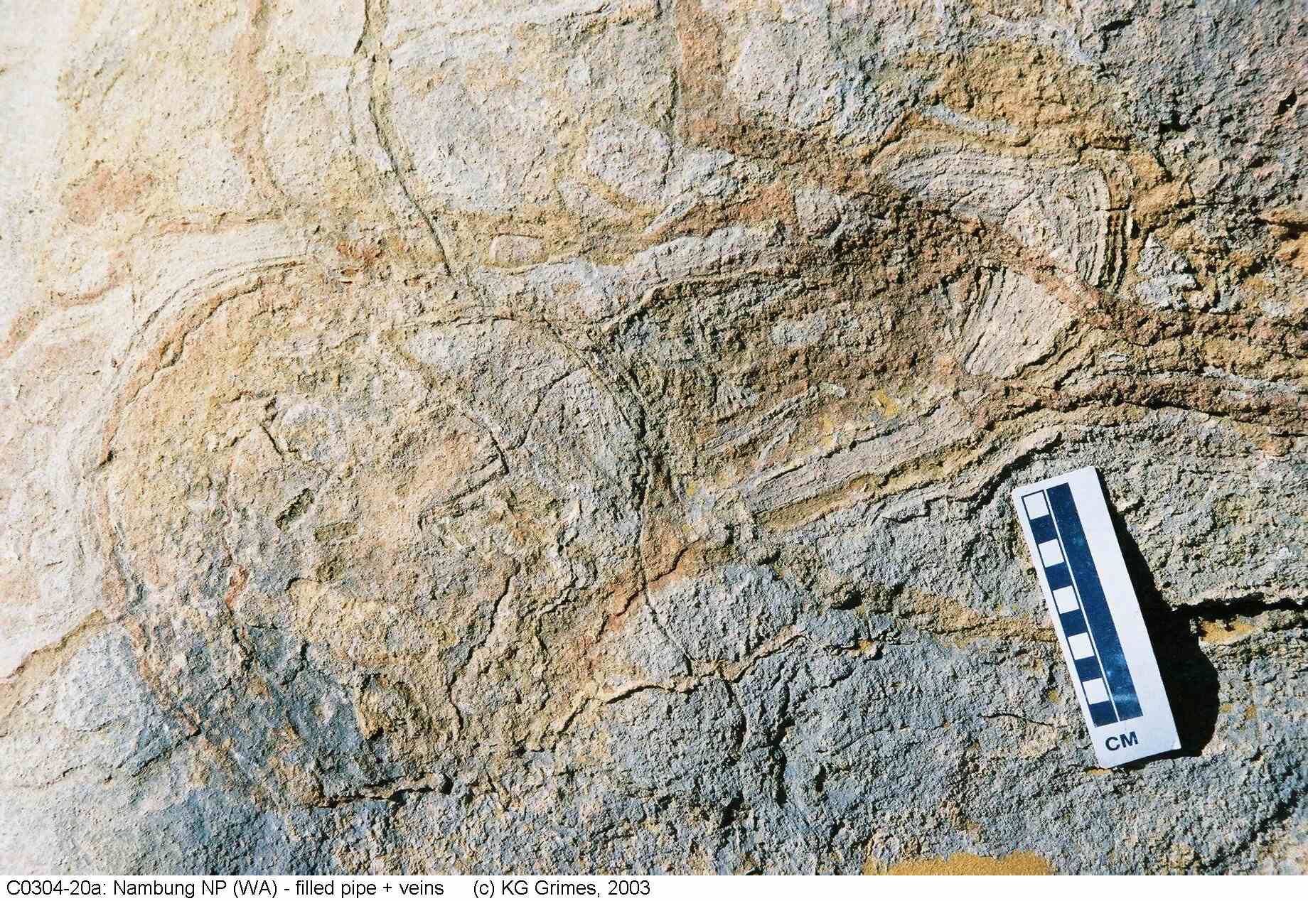 Calcrete structures exposed in the side of a pinnacle: A filled pipe (concentric structures) is cut by later veins. C0304-20.jpg |