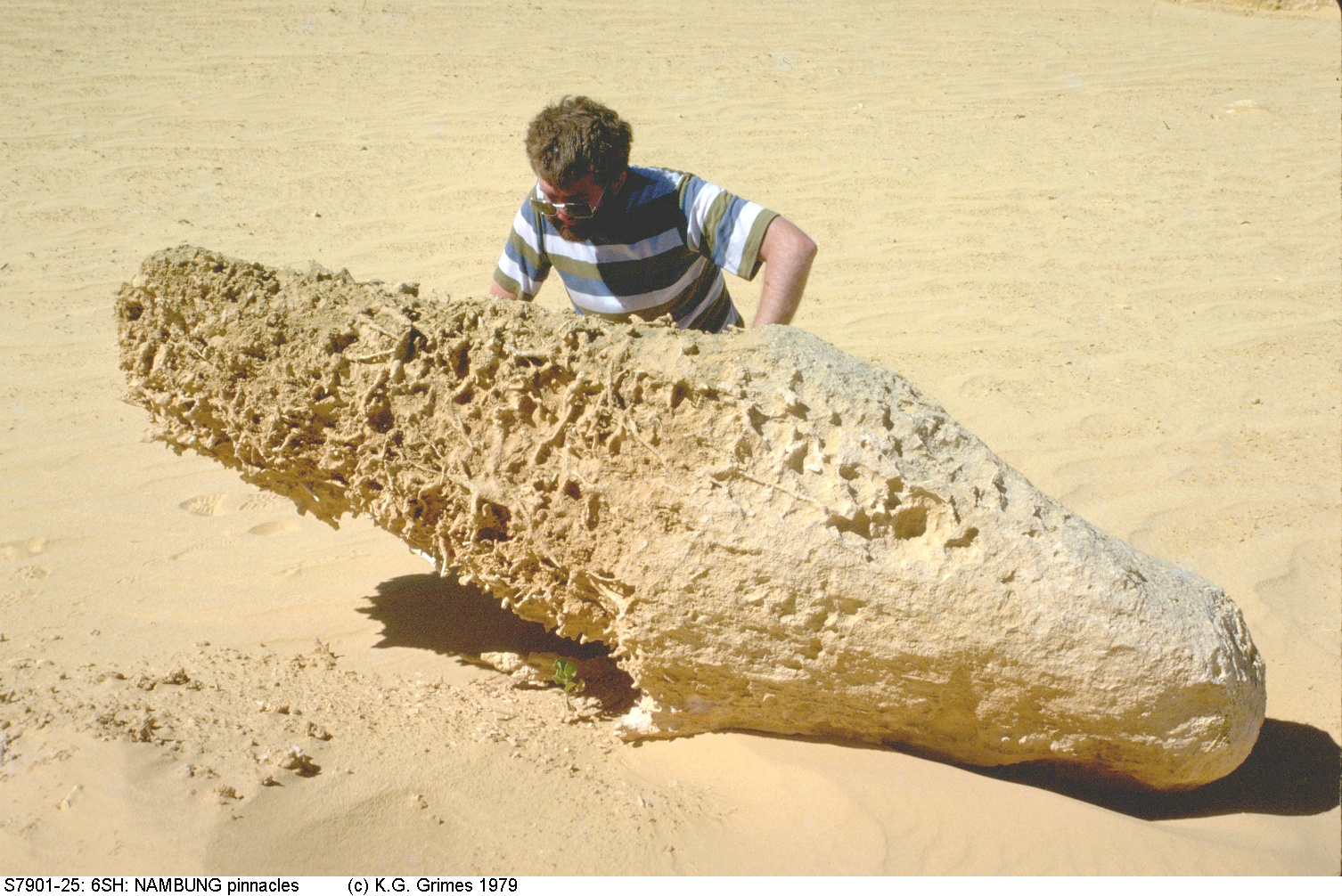 Those pinnacles developed in the calcrete have smooth surfaces, but those developed below have rough surfaces resulting from the fretting of the dune bedding and rhizomorphs. Where both types occur together the calcrete may form a phallic bulb at the top of the pinnacle. Sections of an earlier generation of small solution pipes (0.1 to 0.4 m wide) with a hard concentric fill are exposed in both the calcrete and the bedded material. A few pinnacles are formed entirely of cemented pipe fill (Lipar, 2009, figure 5).