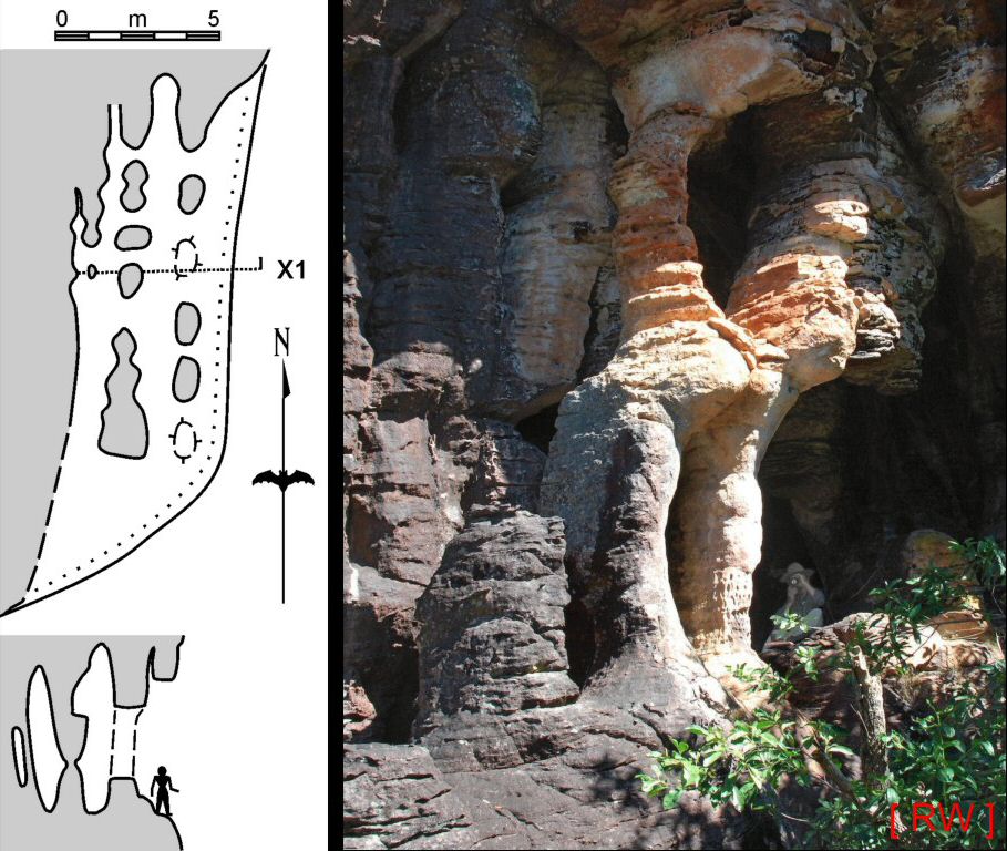 Aubrecht et al 2008, and Grimes et al, 2009a and other workers have shown photos of pillars in the sandstone caves of South America and north Australia (e.g. page 2 in the NSS News of July 2010). Small pillars and pinnacles seen in cliffs and other outcrops at Kakadu are related, but thelarger pinnacles and stoen city blocks are ruiniform features formed by structurally-controlled erosion of jointed sandstones (Grimes et al, 2009a,b ).