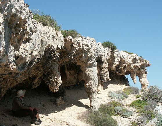 Syngenetic karsts show a range of solution pipes (with and without cemented rims), epikarst pinnacles, cave pendants and cave pillars in dune and beach (& marine) calcarenites. See photos on the pages on "Pipes", "Pinnacles", and caprocks" (the last shows pendant lobes and pillars beneath the calcrete cap). See also Grimes (2004, solution pipes), (2009, pipes and pinnacles), (2011, cemented pendants and pillars); Lipar (2009, pinnacles).