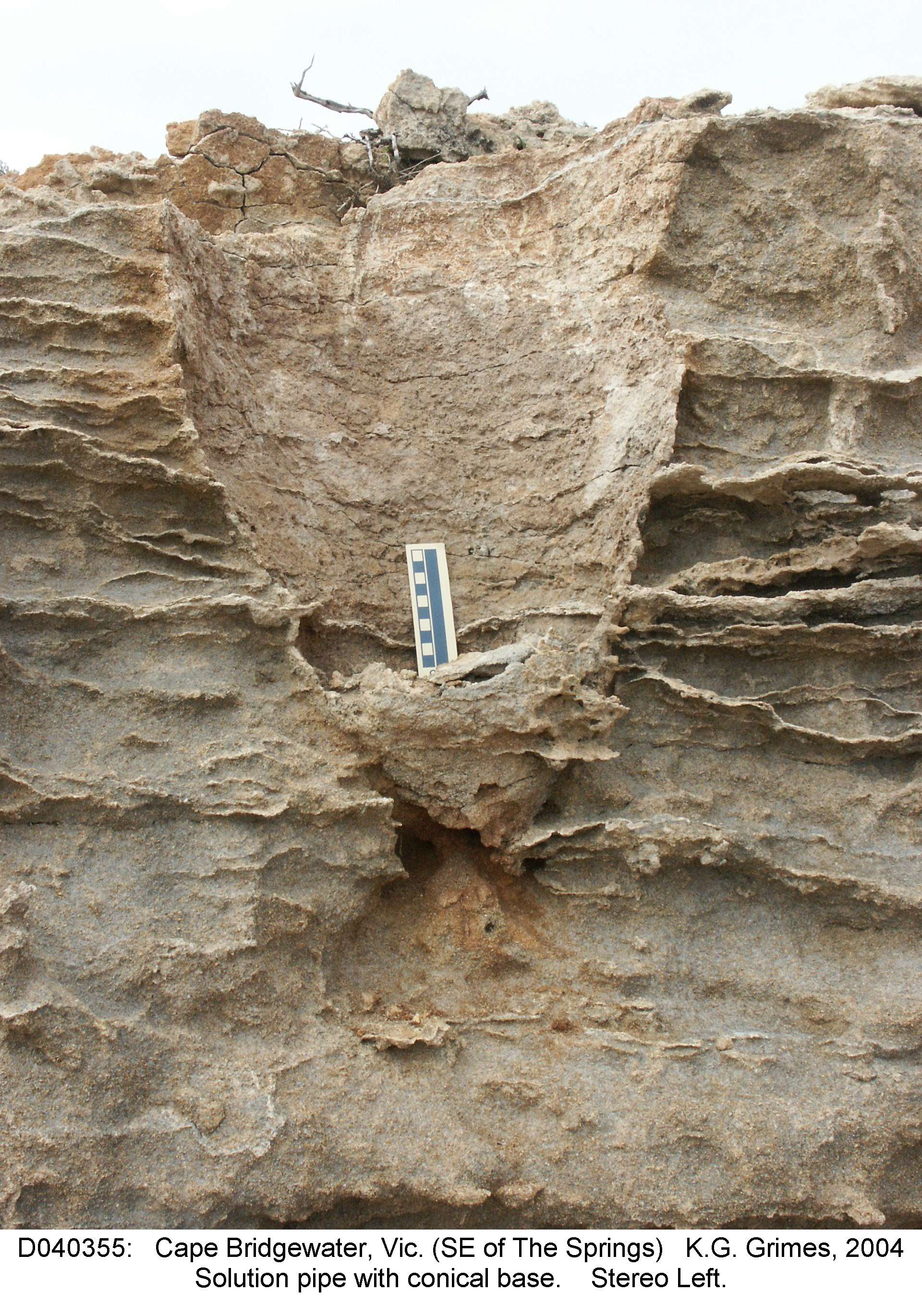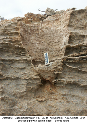 | Stereo-Pair of rounded "cigar-shaped" base to a solution pipe. Scale bar is 10 cm. near "The Springs", Cape Bridgewater, Vic. View the stereopair with your eyes crossed D040355.jpg and D040356.jpg | |