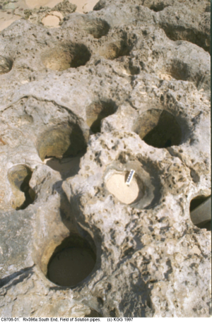 A group of closely-packed solution pipes. Scale bar is 10 cm. Canunda National Park, SA IMG00134.jpg |