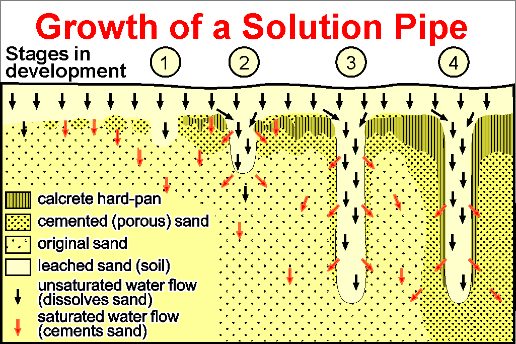 Progressive evolution of a pipe, with cementation of the rim, and the surrounding sand. |